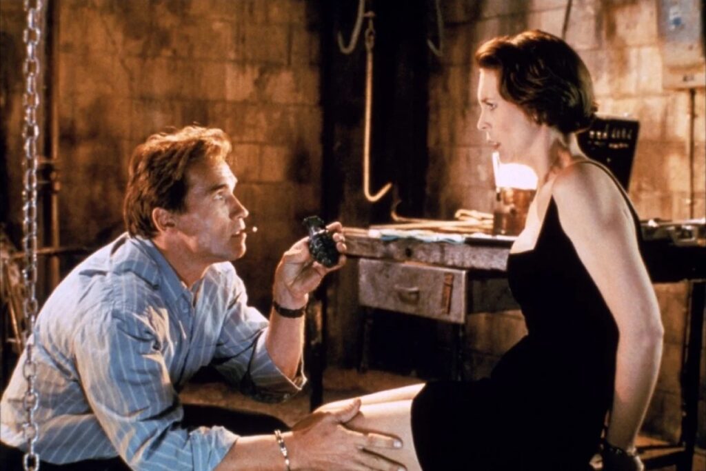 Ovakav odnos ženske potčinjenosti muškom pogledu nastavlja se i u savremenom filmu, istim mehanizmima koje je Malvi opisala u svom eseju Vizuelno zadovoljstvo i narativni film. Kao jedan od najblatantnijih primera može poslužiti akciona komedija Istinite laži (1994) reditelja Džejmsa Kameruna. Protagonista Istinitih laži je tajni agent američke vlade, maskulino otelotvoren glumcem Arnoldom Švarcenegerom. On vodi dvostruki život, čak ni njegova supruga Helen (Džejmi Li Kurtis) nije svesna njegove prave profesije, a kako protagonista zbog svog posla zapostavlja suprugu, ona je nezadovoljna u braku i traga za uzbuđenjem nalazeći ljubavnika. Ipak, pre nego što Helen stigne da izvrši čin prevare, njen muž kidnapuje nju i njenog ljubavnika koristeći se metodama svoje profesije. On anonimno ispituje svoju preplašenu suprugu, a kako bi joj povratio uzbuđenje u život, lažno je angažuje kao vladinu agentkinju kojoj je prva misija da zavede kriminalca tako što ispred njega vršiti strptiz. Ovde dolazimo do dela zapleta koji je naročito značajan za našu analizu. Naime, dok Helen vrši striptiz, ispostavlja se da je anonimni klijent zapravo njen muž koji je celu situaciju aranžirao kao šalu i kao način da od svoje supruge dobije erotski ples. On sedi u mraku, mirno i uzbuđeno posmatrajući Helen, dok kamera prati njene seksualizovane pokrete, sa posebnim naglaskom na glumičine grudi, noge i međunožje. Ovakva fokalizacija dozvoljava muškoj publici da se identifikuje sa protagonistom i da iz njegove perspektive posmatra hiperseksualizovani ženski lik koji i bukvalno vrši erotski performans trojstvu lik-reditelj-gledalac.